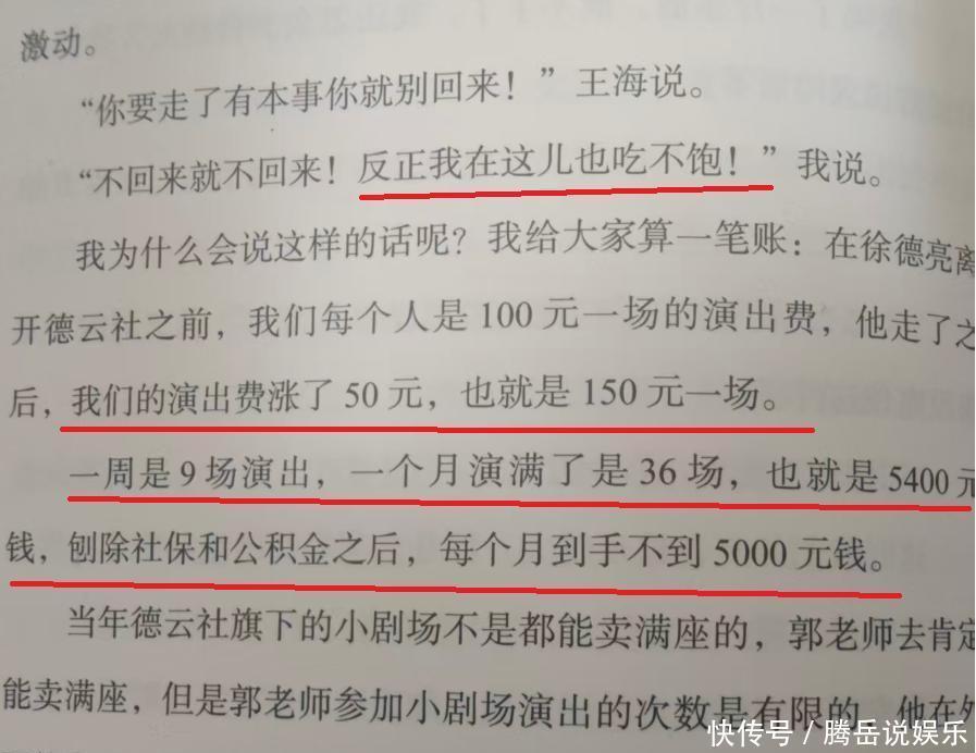 一周9场演出,一个月演满了是36场,共计5400元,刨除各项费用拿到手不到5000元,所以曹云金说我在这儿吃不饱,这也是曹云金在外面接戏的重要原因。